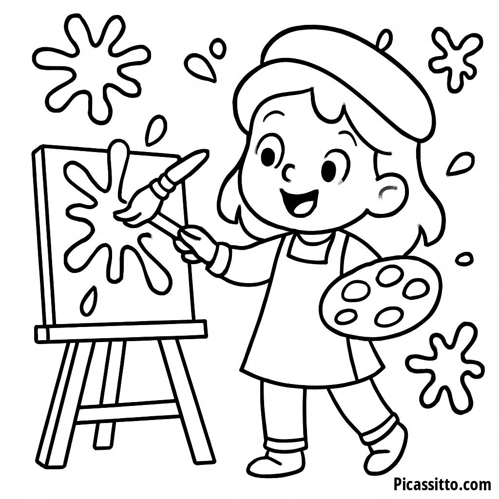 Desata tu creatividad con esta página para colorear gratis y imprimible de la Artista Alegre, ¡que presenta a una niña salpicando colores en su lienzo!