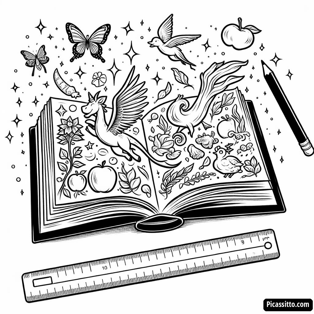 Descarga esta página para colorear gratuita e imprimible que presenta un libro abierto con criaturas mágicas volando y una regla cercana. ¡Perfecta para despertar la creatividad!