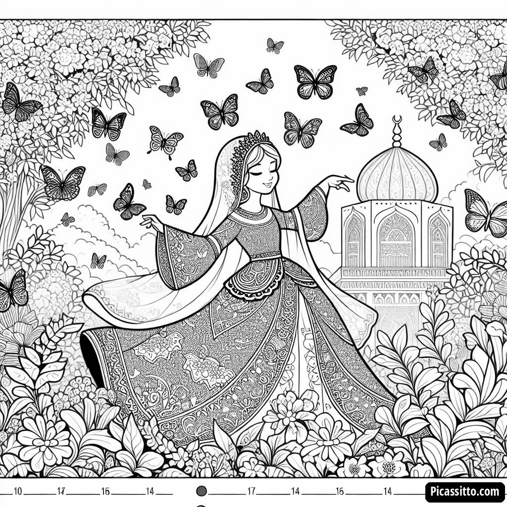 Disfruta de esta página para colorear gratuita e imprimible que presenta a una princesa bailando en un hermoso jardín rodeada de mariposas. ¡Perfecta para inspirar la creatividad en los jóvenes artistas!