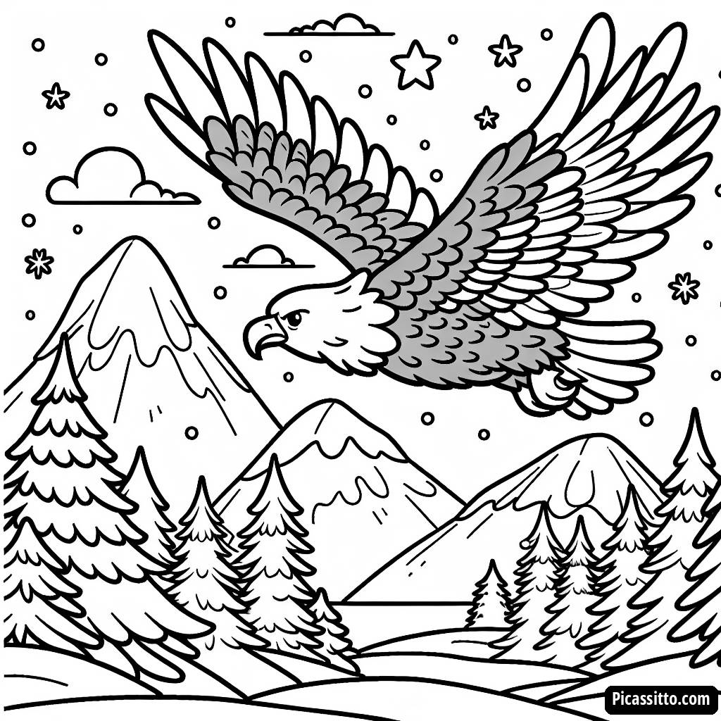 Descarga esta página para colorear del águila en vuelo, gratuita y imprimible, perfecta para los niños que aman las aves y la naturaleza.