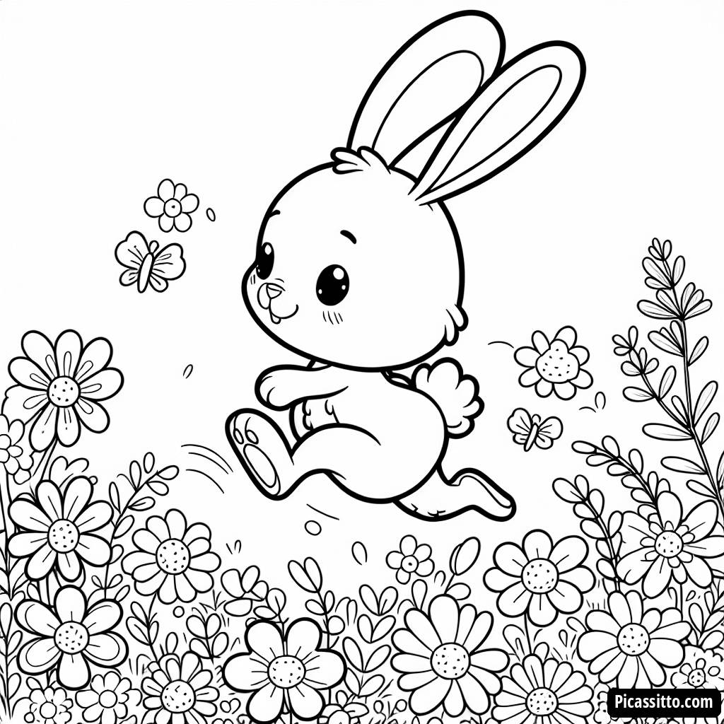 Disfruta de esta página para colorear gratuita y imprimible de un conejito de primavera, donde un lindo conejito salta por un campo de flores en plena floración. ¡Perfecto para que los niños desaten su creatividad!