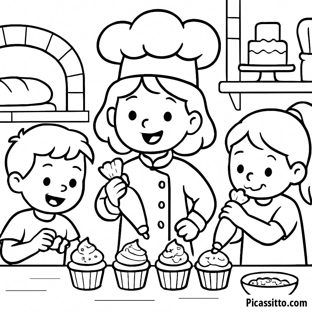 Descarga esta gratuita y imprimible Página para Colorear de Dulce Diversión en la Panadería, donde los niños pueden disfrutar decorando cupcakes con coloridos glaseados y chispas.