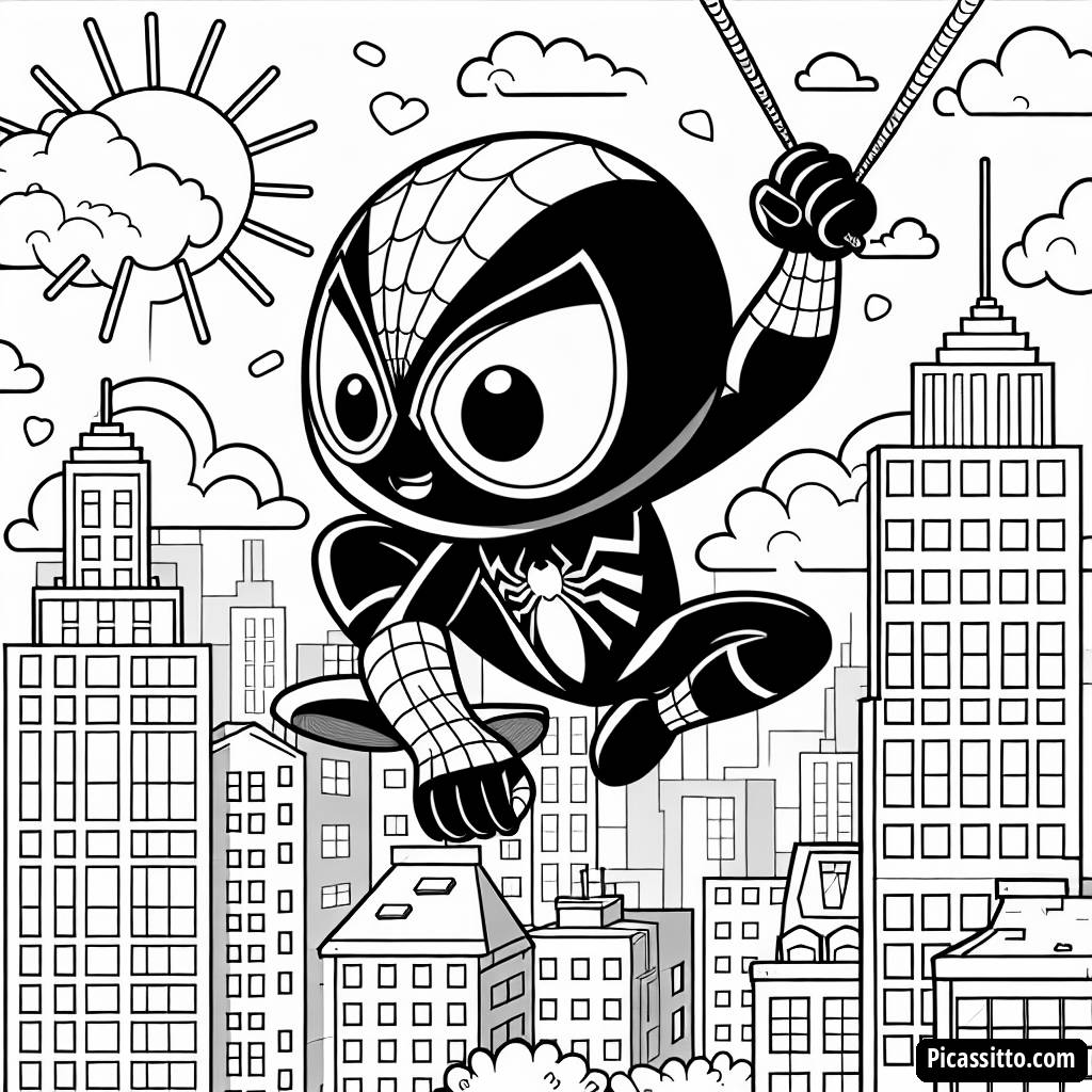 Descarga esta página para colorear gratis de Spider-Man, ¡donde aparece saltando por un vibrante horizonte urbano!
