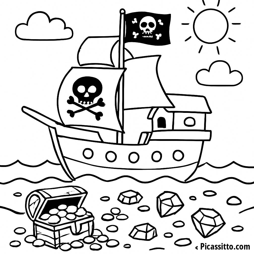 Partez à l'aventure avec cette page à colorier gratuite et imprimable de bateau pirate, avec un drapeau Jolly Roger et une mer remplie de trésors !