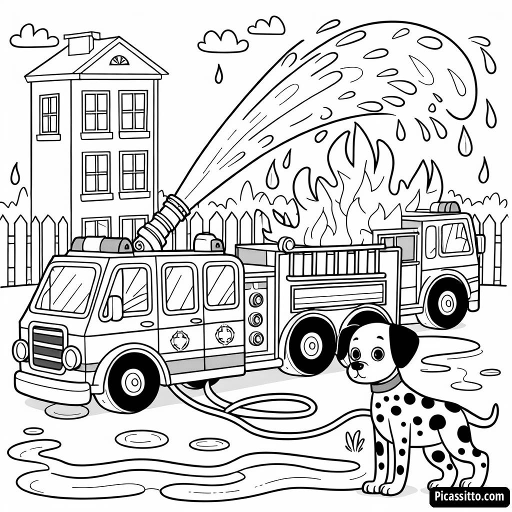 Téléchargez cette page à colorier gratuite mettant en scène un camion de pompiers courageux pulvérisant de l'eau sur un bâtiment en feu fictif avec un dalmatien à proximité. Parfait pour les enfants qui adorent l'aventure !