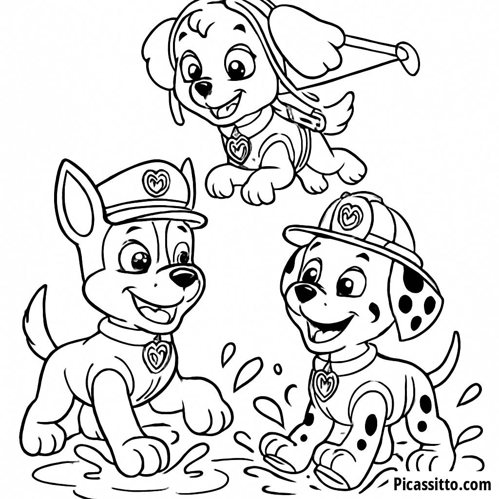 Téléchargez cette page à colorier gratuite et imprimable de Chase et Marshall s'amusant à éclabousser dans une flaque, pendant que Skye vole joyeusement au-dessus! Parfaite pour les enfants qui adorent Paw Patrol.