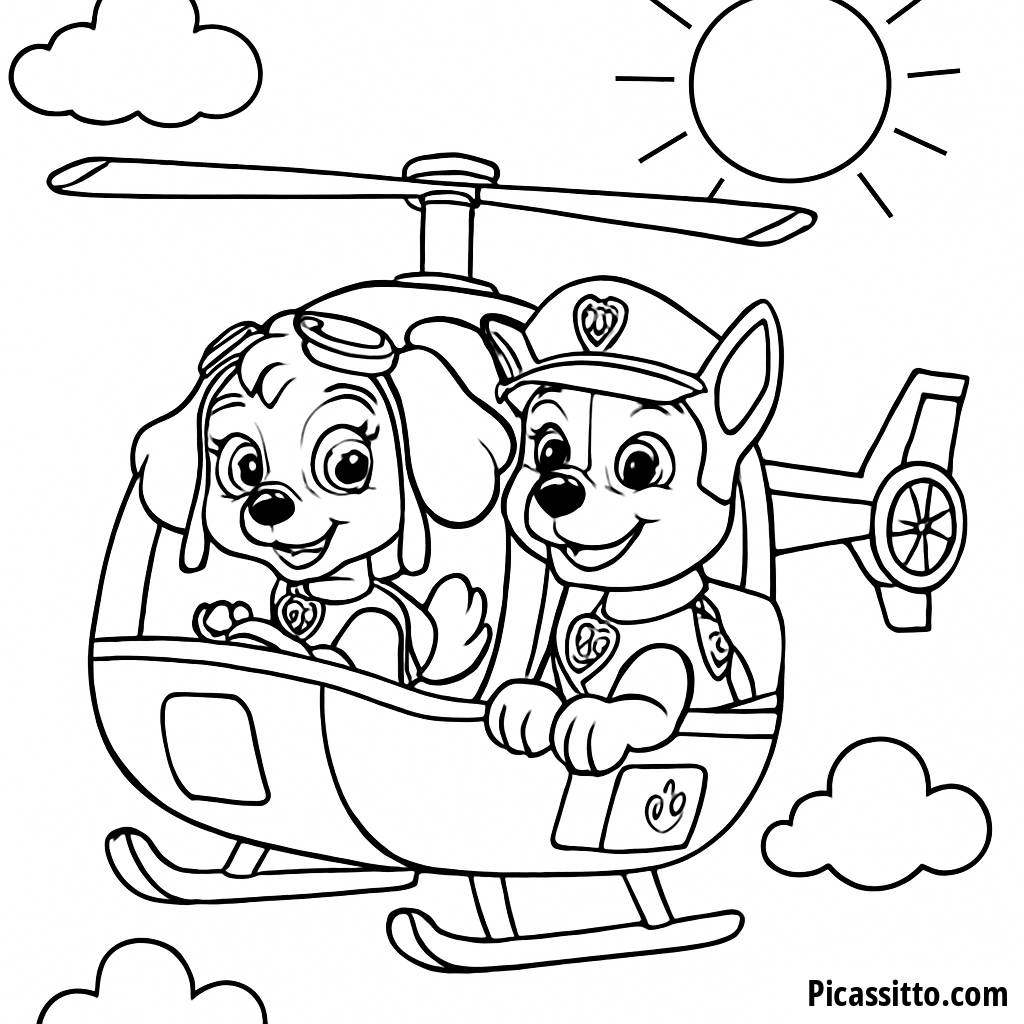 Profitez de cette page à colorier gratuite et imprimable mettant en scène Chase et Skye volant en hélicoptère au milieu de nuages duveteux et d'un soleil éclatant. Parfaite pour les petits fans de Paw Patrol!