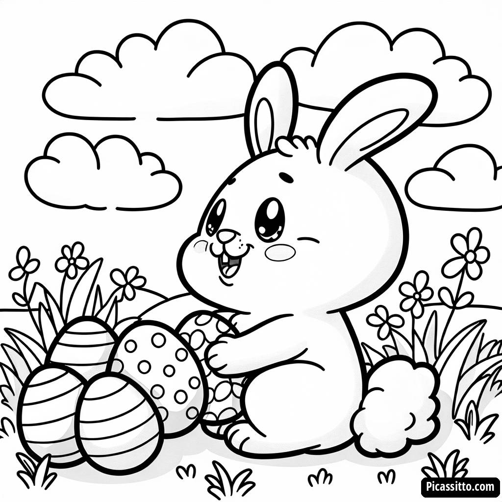 Téléchargez cette page à colorier gratuite d'un lapin joyeux cachant des oeufs colorés dans l'herbe. Parfaite pour s'amuser à Pâques!