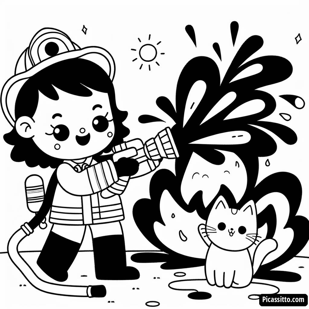 Téléchargez cette page à colorier gratuite et imprimable d'un pompier joyeux, représentant un pompier courageux arrosant un feu de dessin animé avec un chat heureux à proximité !
