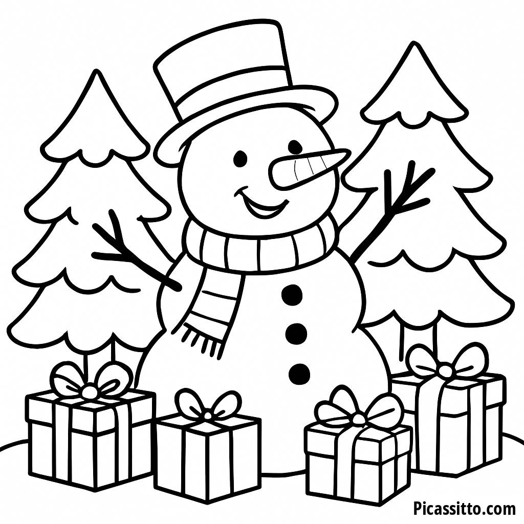 Profitez de cette page à colorier gratuite et imprimable mettant en vedette un bonhomme de neige joyeux, entouré d'arbres de Noël et de cadeaux colorés. Parfaite pour s'amuser pendant les fêtes !
