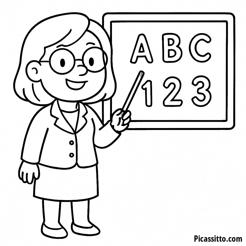 Téléchargez gratuitement cette page à colorier de l'enseignant joyeux, présentant un enseignant heureux pointant vers un tableau noir rempli de lettres et de chiffres!