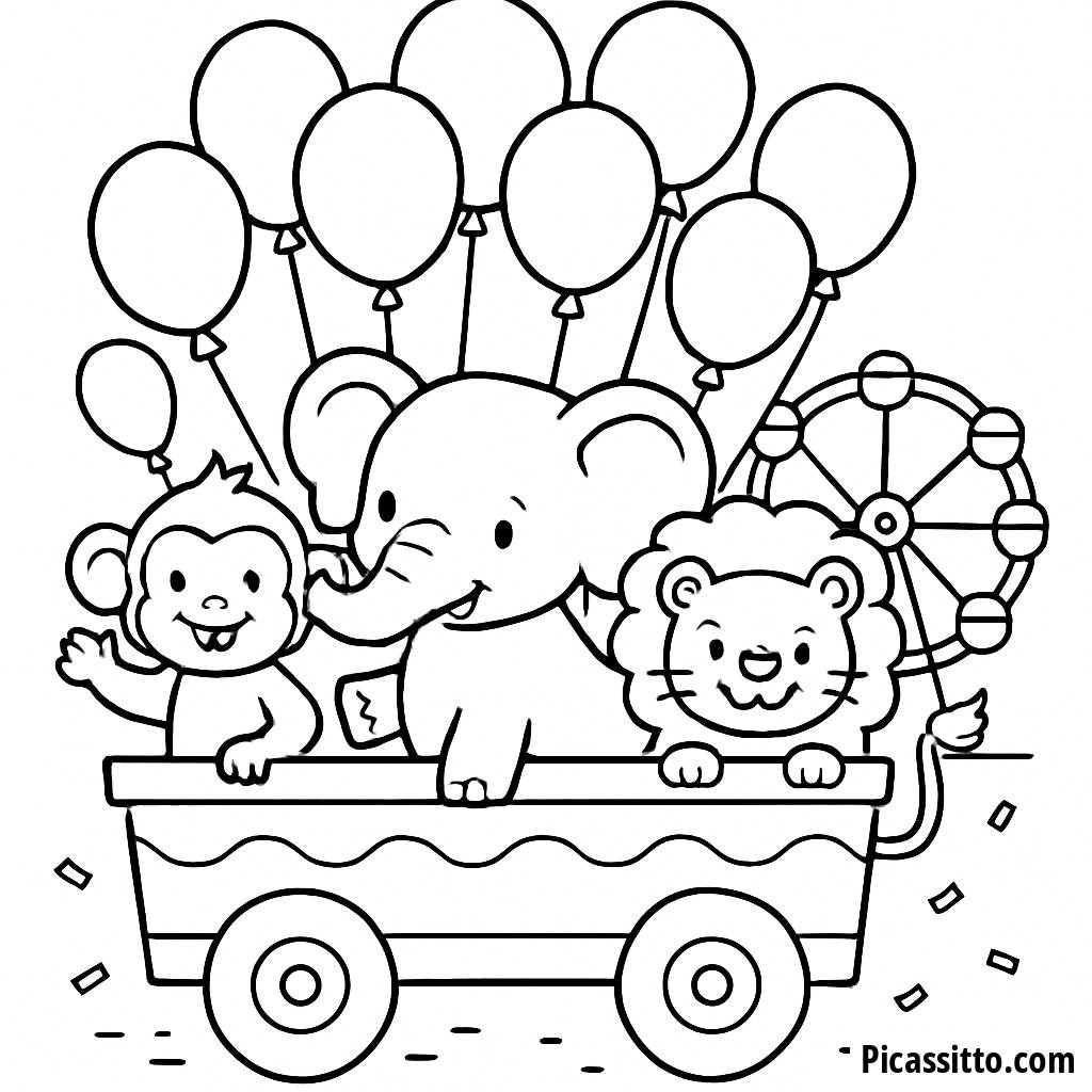 Profitez de cette page à colorier gratuite et imprimable mettant en vedette un char coloré de défilé avec des ballons et des animaux amusants. Parfaite pour stimuler la créativité des enfants !