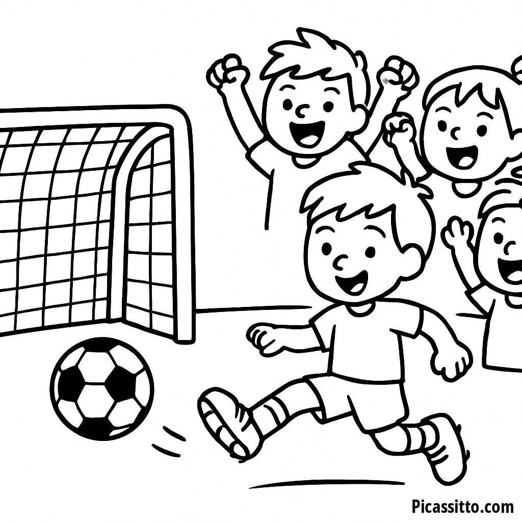 Téléchargez cette page à colorier gratuite et imprimable d'un garçon tirant au but au foot tandis que ses amis l'encouragent ! Parfaite pour les jeunes fans de football.