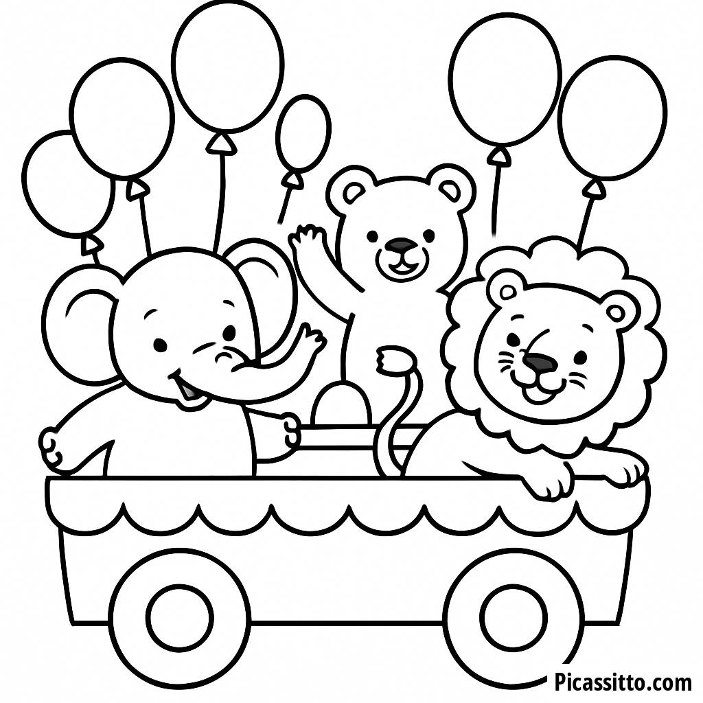 Téléchargez cette page à colorier gratuite et imprimable représentant un char de parade coloré avec des animaux joyeux et des ballons vibrants pour des heures de créativité!