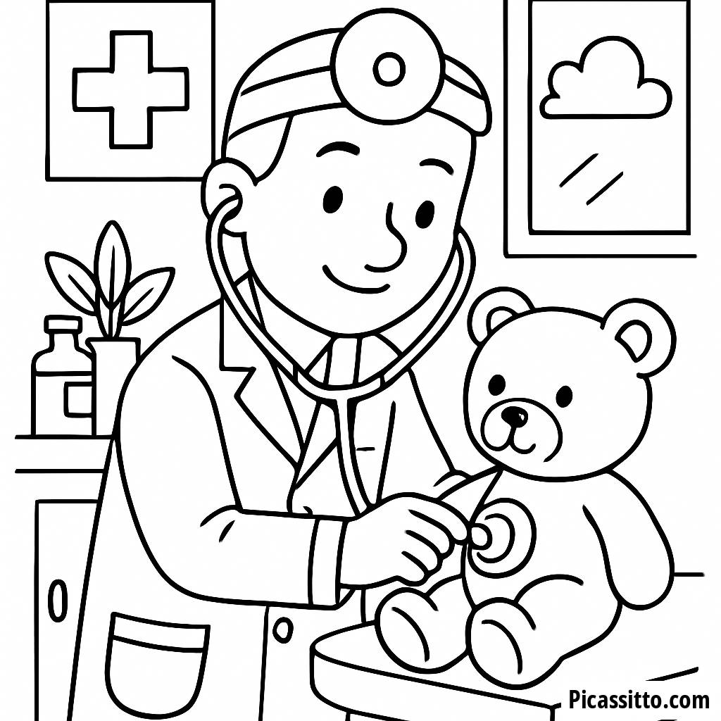 Téléchargez cette page à colorier gratuite et imprimable, mettant en scène un docteur amical examinant un ourson avec un stéthoscope dans une clinique colorée. Idéale pour les petits artistes !