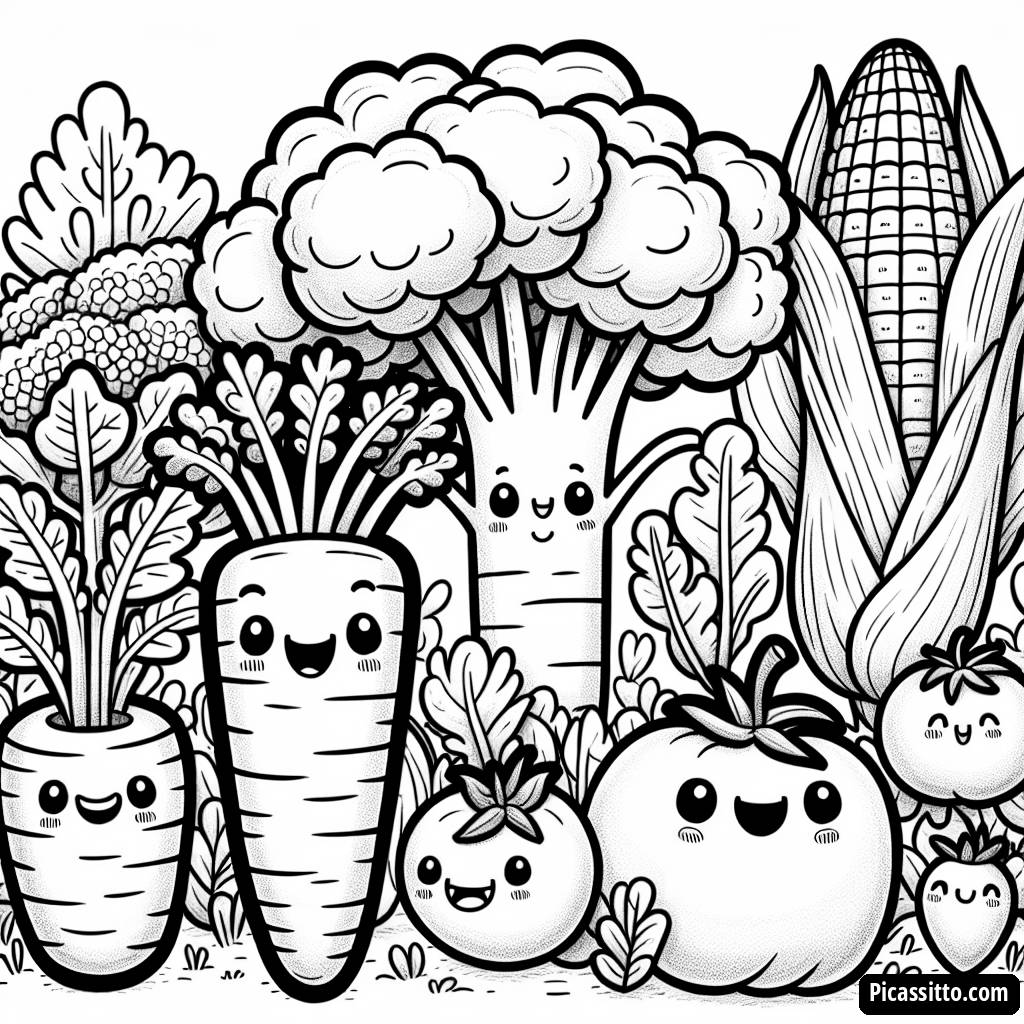 Préparez-vous à égayer votre journée avec cette page à colorier gratuite et imprimable du Jardin de Légumes Heureux, mettant en vedette des carottes souriantes, des arbres de brocoli, des tomates juteuses et des épis de maïs joyeux !