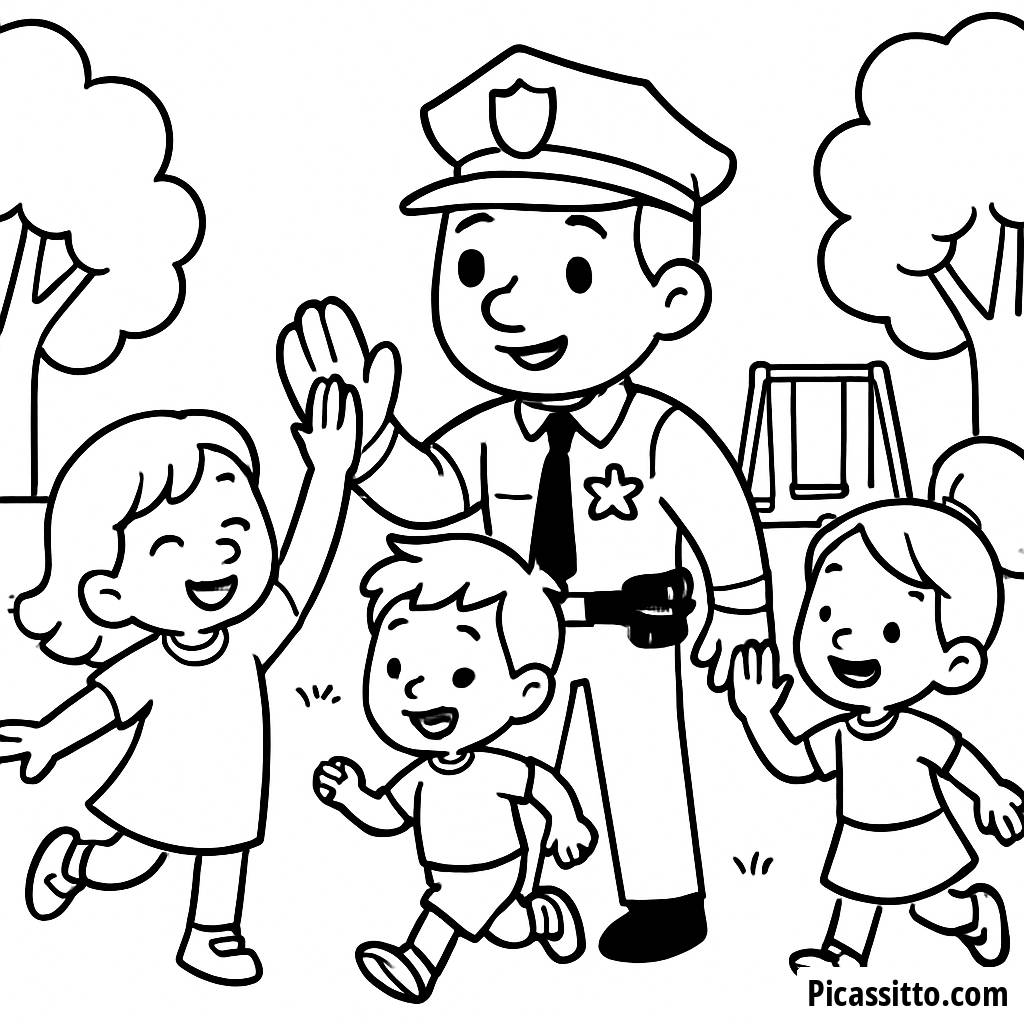 Profitez de cette page à colorier gratuite et imprimable d'un policier faisant un high-five à des enfants jouant dans le parc. Parfaite pour les enfants qui adorent les héros de la communauté !