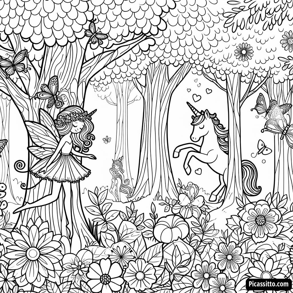 Rejoignez l'aventure dans une forêt magique peuplée de fées dansantes et d'une licorne curieuse ! Cette page à colorier est gratuite et imprimable pour stimuler la créativité.