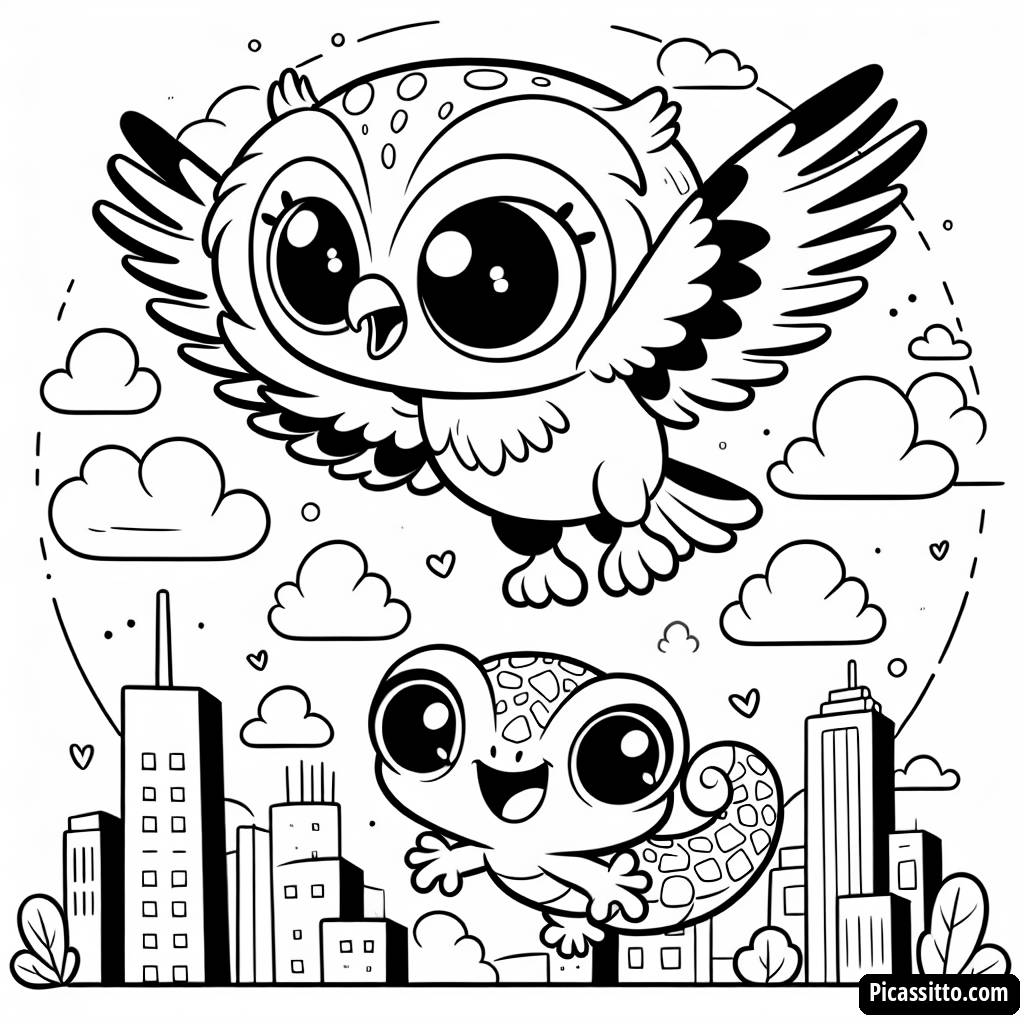 Téléchargez cette page à colorier gratuite d'Owlette et Gekko pour laisser votre créativité s'envoler alors qu'ils volent ensemble à travers des nuages colorés et un horizon urbain vibrant.