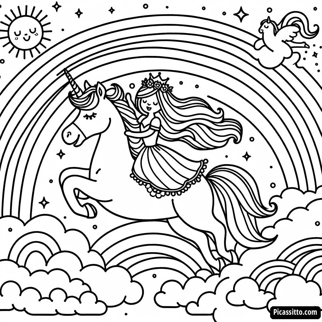Profitez de cette page à colorier gratuite et imprimable mettant en scène une princesse chevauchant une licorne à travers un ciel magique rempli d'arc-en-ciel. Parfaite pour les petits artistes !
