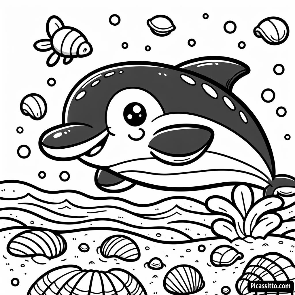 Profitez d'une journée ensoleillée à la plage avec cette page à colorier gratuite et imprimable, mettant en vedette des coquillages et un dauphin joueur sautant dans les vagues !