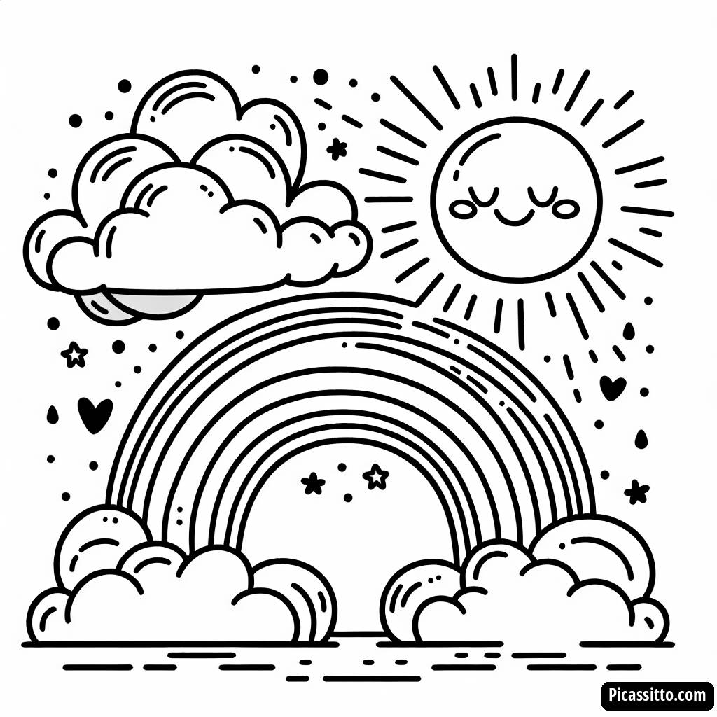Profitez de cette page à colorier gratuite et imprimable du soleil souriant, avec un arc-en-ciel coloré et des nuages moelleux.