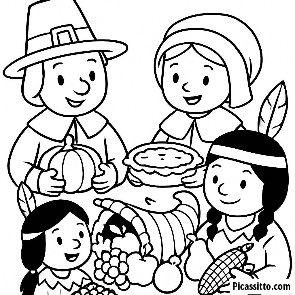 Page à Colorier de Thanksgiving : Pèlerins et Amérindiens Partageant un Festin