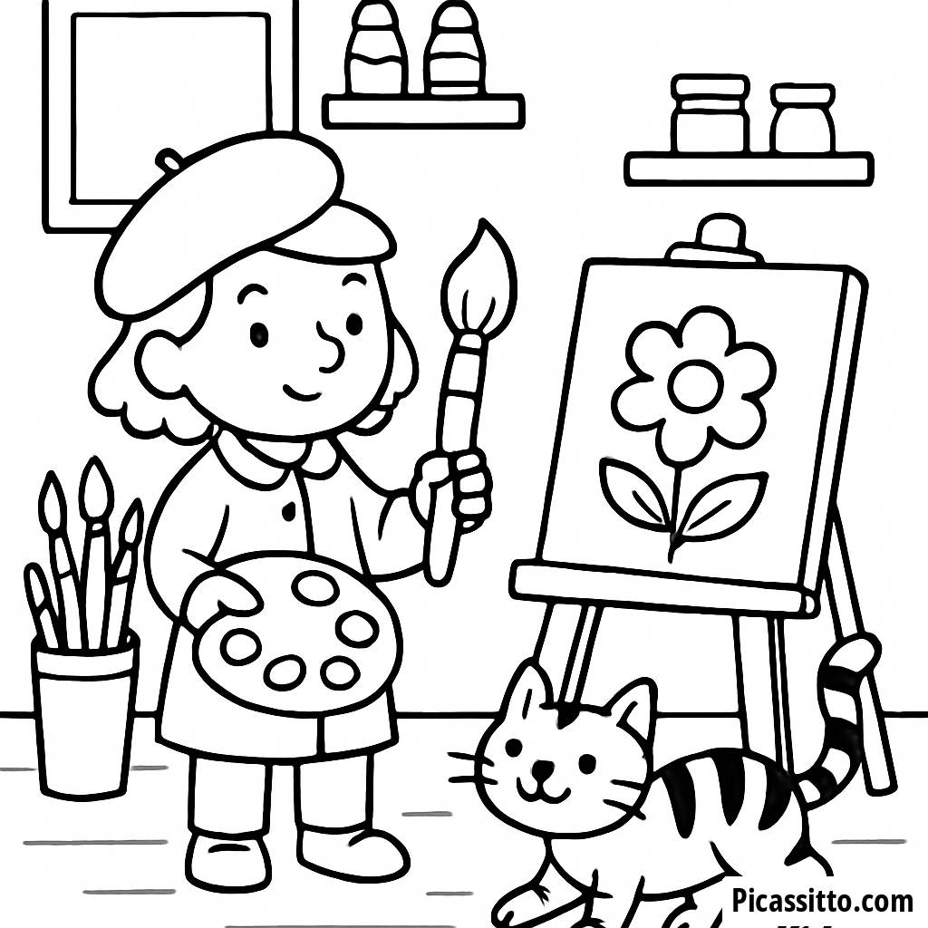 Téléchargez cette page à colorier gratuite et imprimable d'un atelier artistique fantaisiste, remplie de pinceaux, de toiles et d'un chat espiègle. Parfaite pour stimuler la créativité!