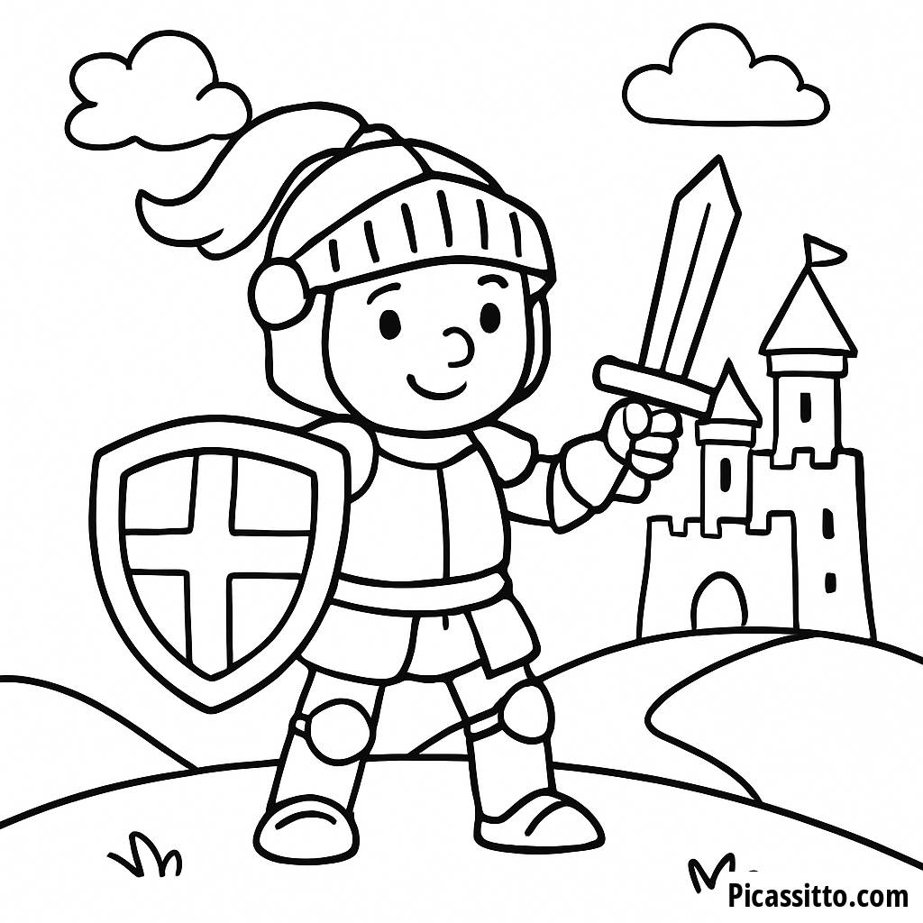 Scarica e stampa questa pagina da colorare gratuita del coraggioso cavaliere, con un cavaliere in armatura splendente con spada e scudo, pronto per l'avventura!
