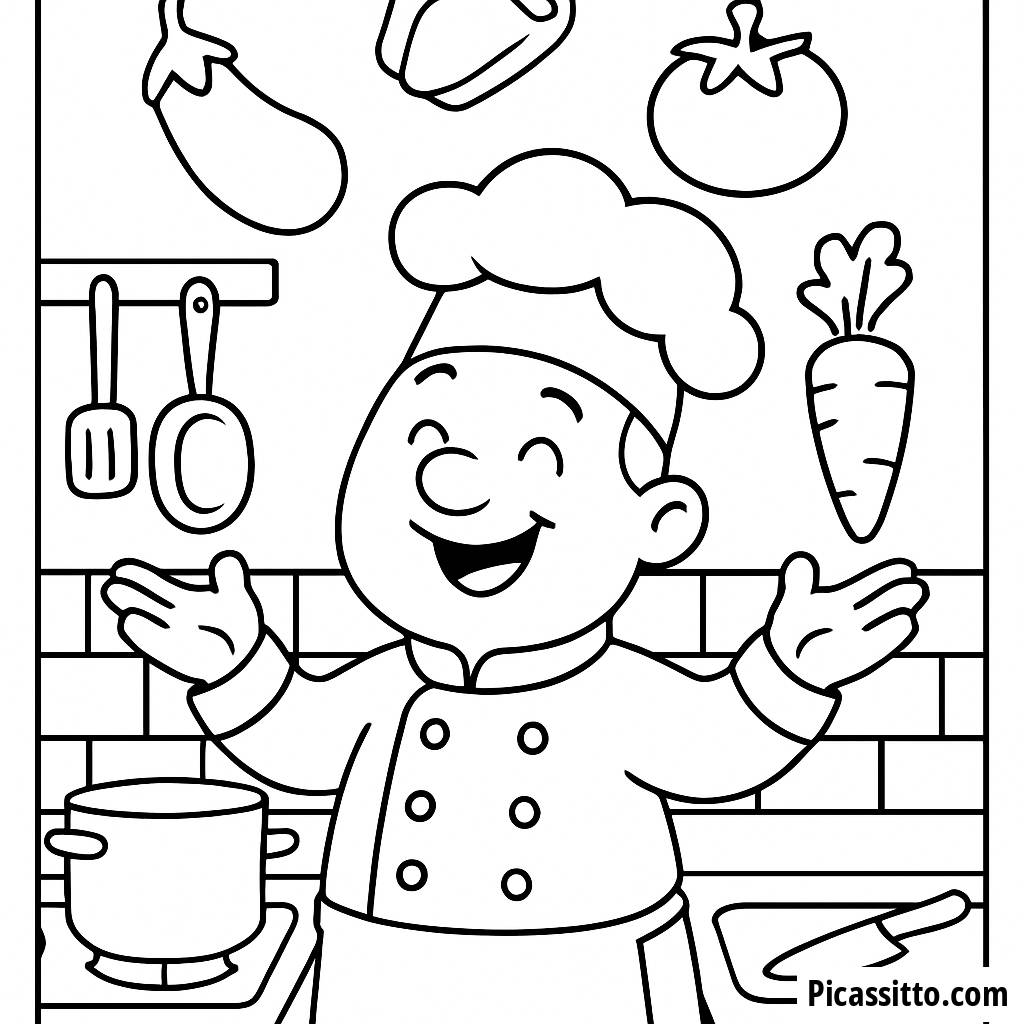 Scarica questa pagina da colorare gratuita e stampabile del cuoco allegro che gioca con le verdure colorate per un divertimento e una creatività senza fine!