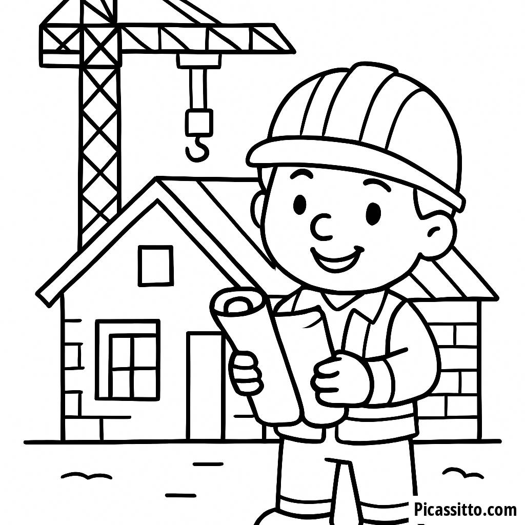 Scarica questa pagina da colorare gratuita e stampabile con un felice lavoratore edile con progetti accanto a una casa in costruzione e una gru sullo sfondo.