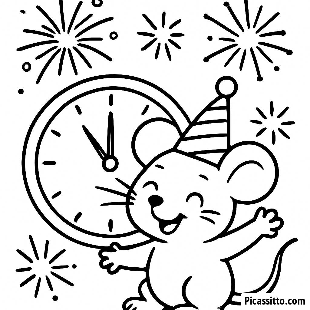 Festeggia il Capodanno con questa pagina da colorare del topo allegro, circondato da fuochi d'artificio festivi e un grande orologio che segna la mezzanotte. È gratuito e stampabile per un divertimento di colorazione senza fine!