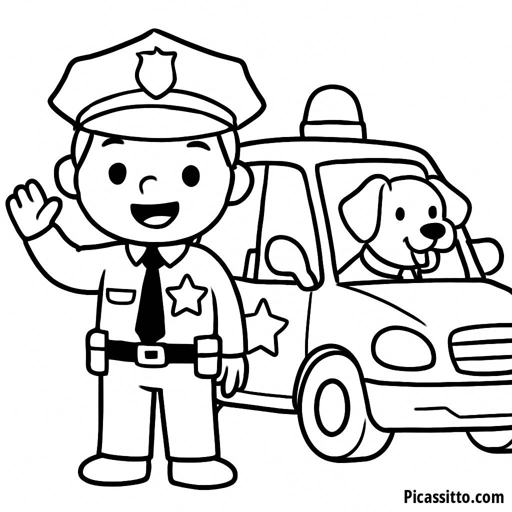 Scarica questa pagina da colorare gratuita e stampabile con un poliziotto allegro che saluta accanto a un cane amichevole e a una macchina della polizia. Perfetta per giovani artisti e futuri eroi!