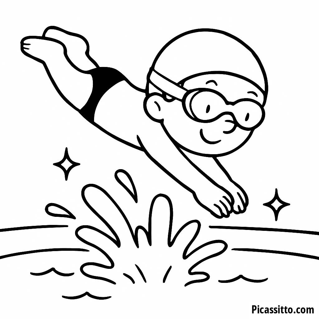 Tuffati nel divertimento con questa pagina da colorare gratuita e stampabile che presenta un nuotatore allegro che salta in una piscina scintillante!