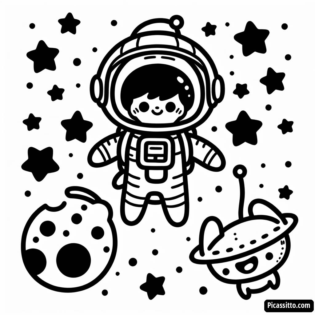 Scarica questa pagina da colorare gratuita e stampabile sull'Avventura Cosmica, con un astronauta che fluttua nello spazio insieme a un alieno amichevole e stelle scintillanti!