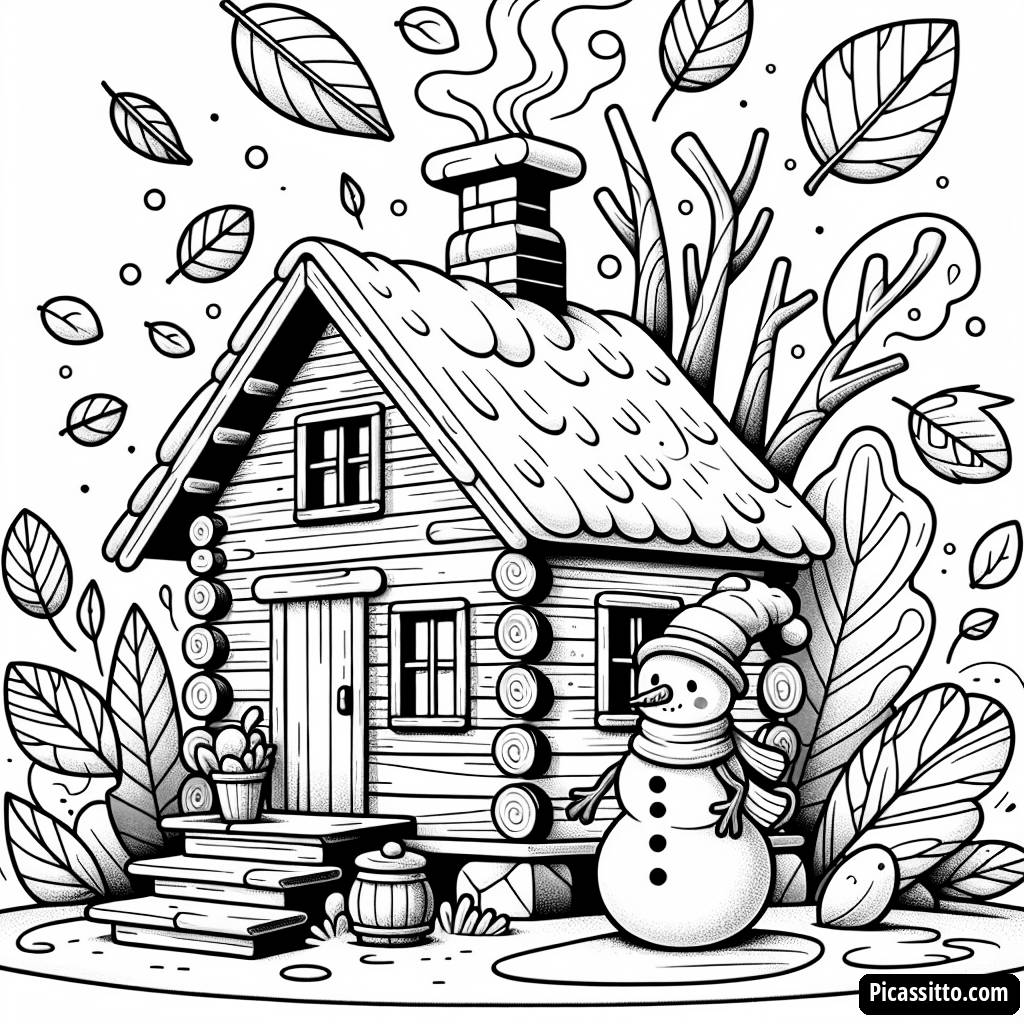 Scarica questa pagina da colorare gratuita di una cabina accogliente, completa di foglie che cadono e un simpatico pupazzo di neve! Perfetta per i bambini che amano la bellezza delle stagioni.