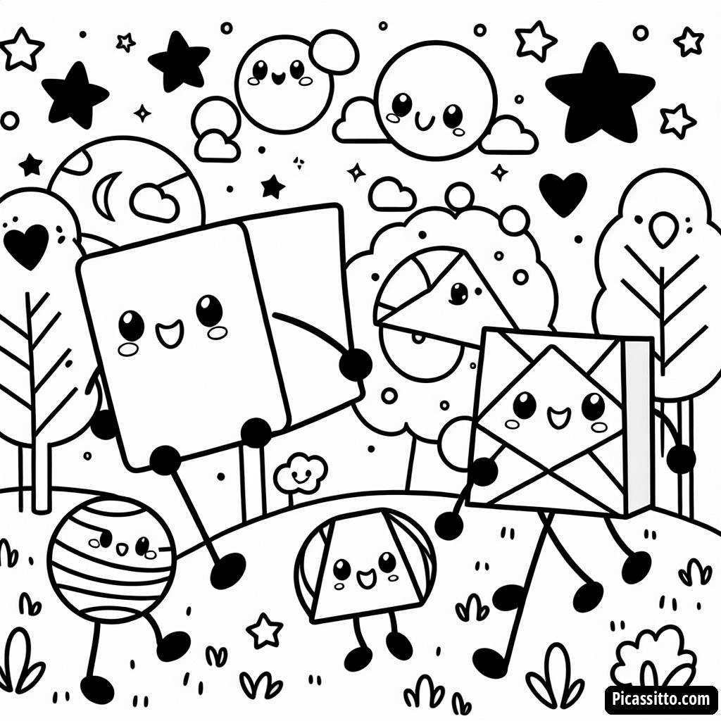 Scarica questa pagina da colorare gratuita e stampabile con forme danzerine, che presentano cerchi, quadrati, triangoli e stelle che si divertono in un parco!