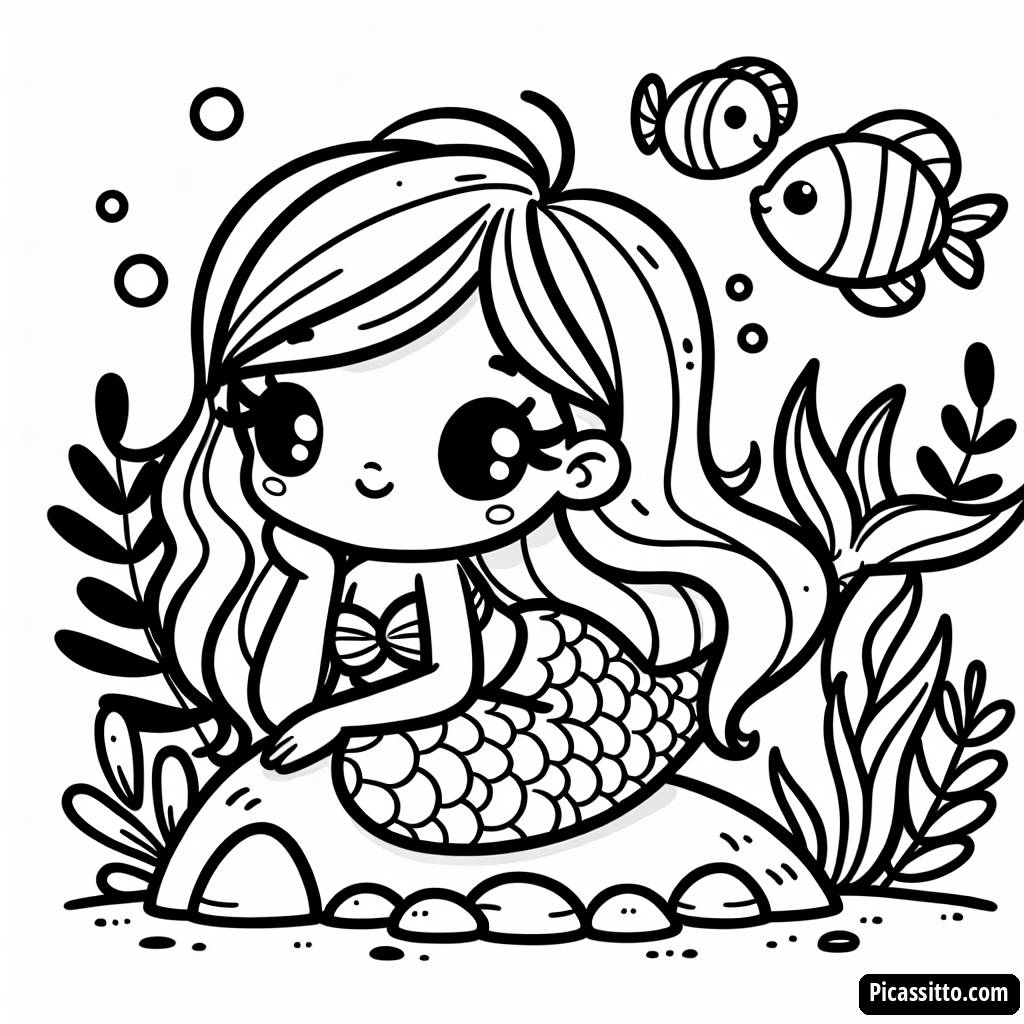 Immergiti nella creatività con la nostra pagina da colorare di sirena incantevole, gratuita e stampabile, che presenta una bella sirena sdraiata su una roccia circondata da pesci colorati e alghe.