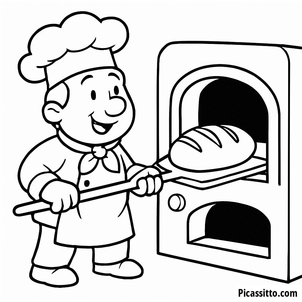 Scarica questa pagina da colorare gratuita e stampabile del Pasticcere Felice, che presenta un pasticcere allegro che estrae pane fresco dal forno, perfetta per i piccoli artisti!