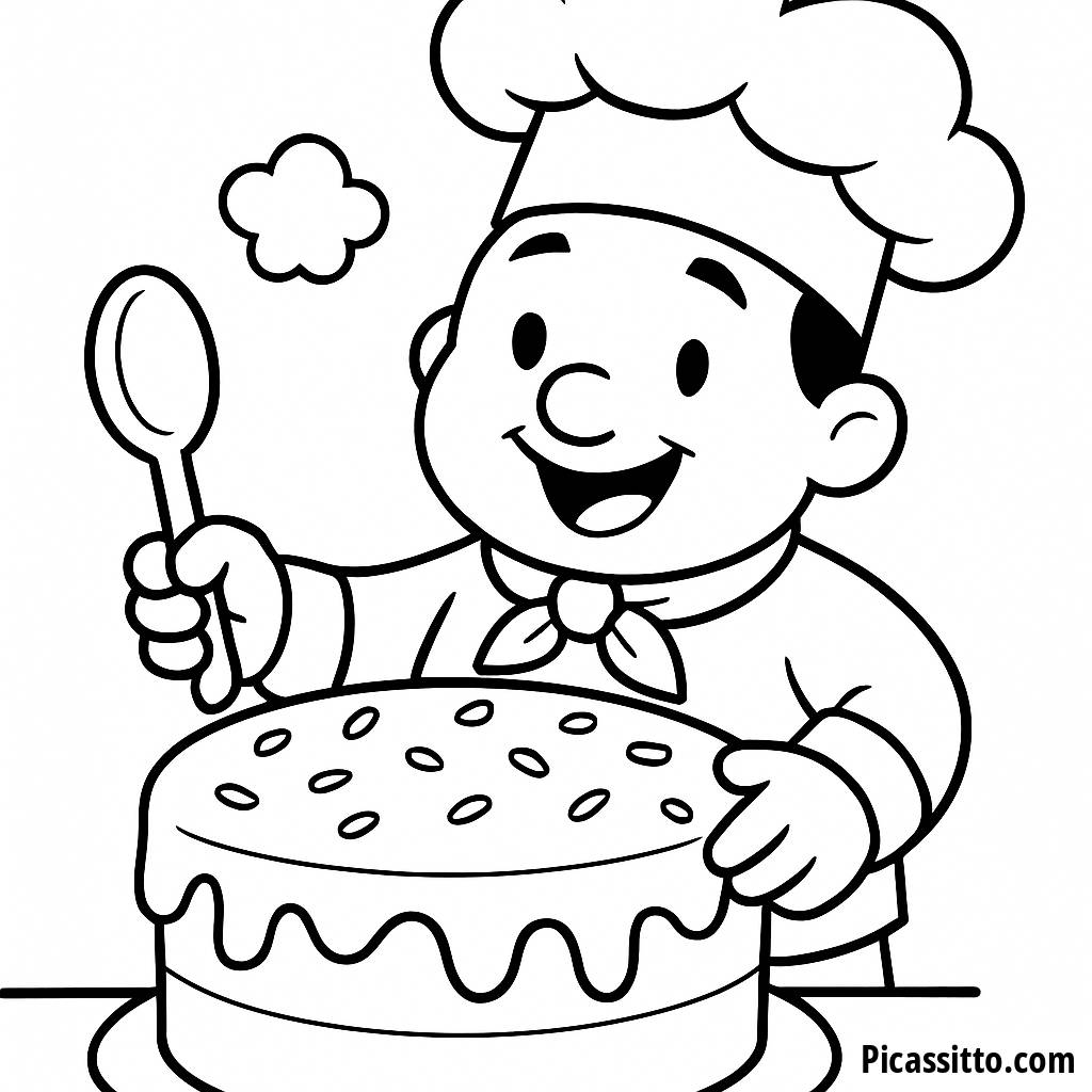 Scarica questa pagina da colorare gratuita del cuoco felice con una gigantesca torta ricoperta di zuccherini e glassa, pronta da stampare!