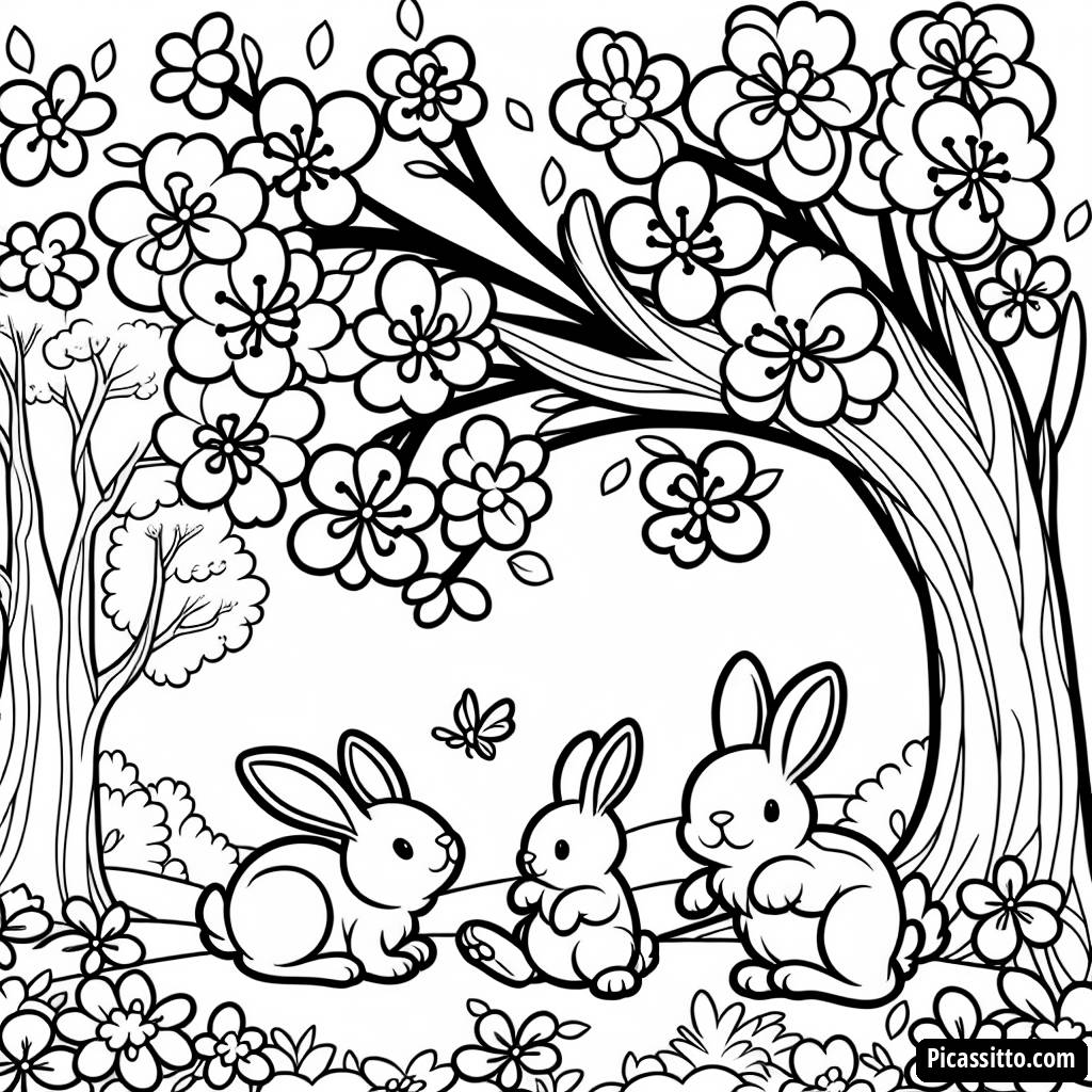 Divertiti con questa pagina da colorare gratuita e stampabile, che presenta coniglietti che saltano sotto alberi in fiore. Perfetta per il divertimento pasquale!