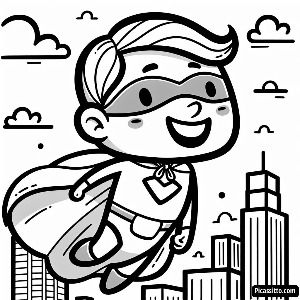 Scarica questa pagina da colorare gratuita e stampabile di supereroi e lascia che tuo figlio dia vita a un eroe volante sopra lo skyline della città!