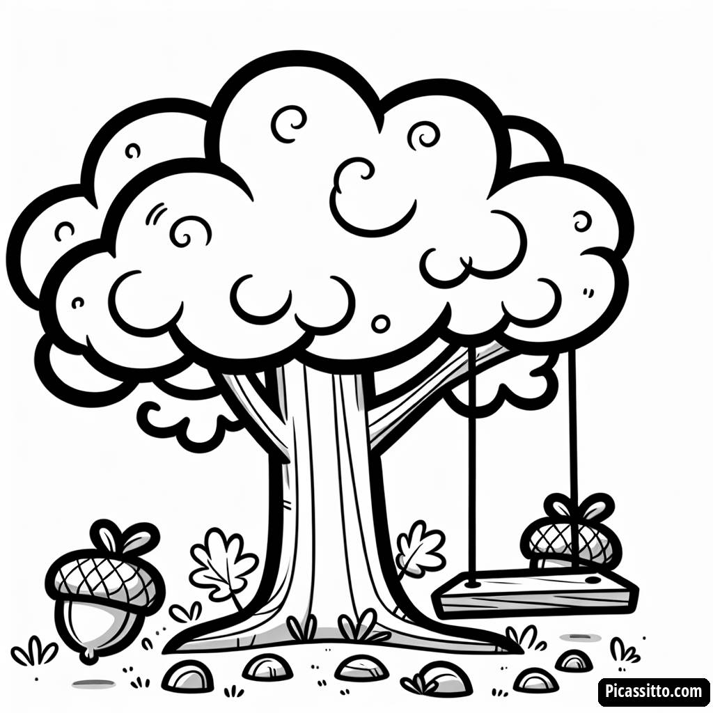 Divertiti con questa pagina da colorare gratuita e stampabile che presenta un alto ontano con ghiande e un'altalena! Perfetta per i bambini che amano la natura.