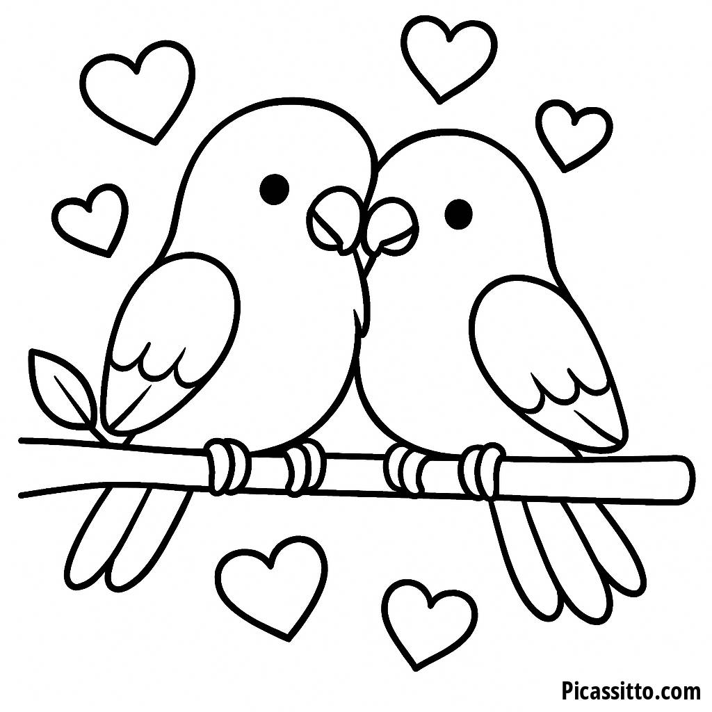 Baixe esta página para colorir grátis e imprimível com dois pássaros apaixonados empoleirados em um galho, cercados por corações. Perfeito para a criatividade do Dia dos Namorados!