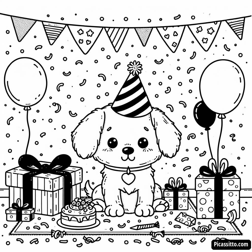 Celebre com nossa página para colorir gratuita de um adorável cachorrinho de aniversário, perfeita para os pequenos artistas que adoram festas!
