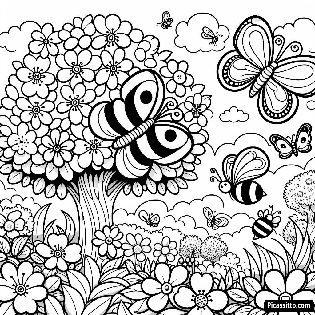 Baixe esta página para colorir do jardim florescente, gratuita e imprimível, com lindas borboletas e abelhas zumbidoras, perfeita para a diversão da primavera!