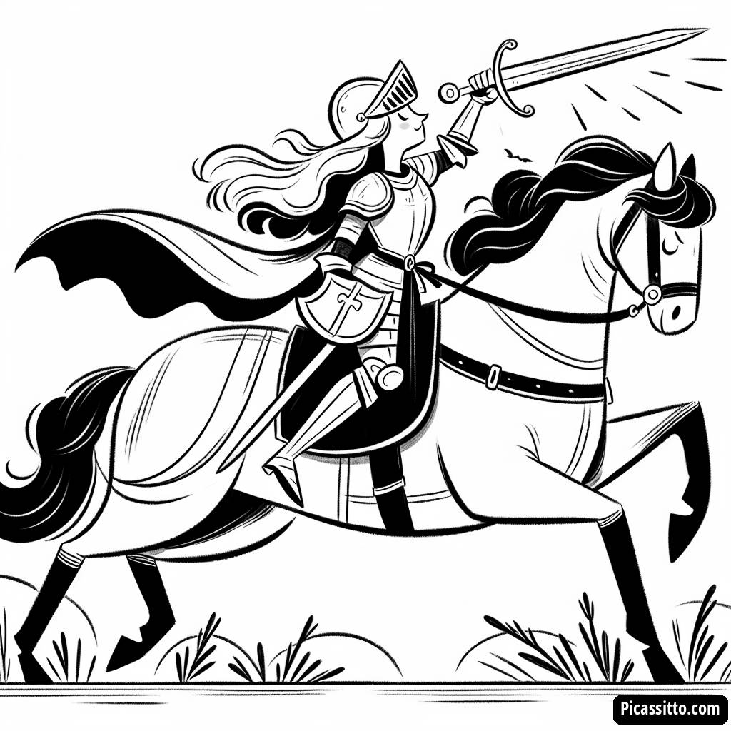 Baixe esta página para colorir grátis e imprimível de um cavaleiro corajoso para seus pequenos aventureiros! Deixe a criatividade deles brilhar enquanto coloram um cavaleiro em um cavalo segurando a espada alta.