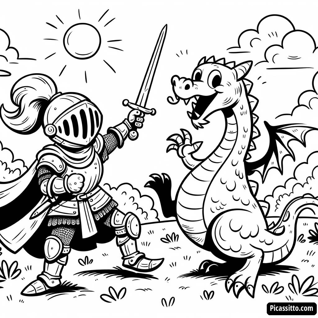 Baixe esta página para colorir gratuita e imprimível que apresenta um valente cavaleiro lutando contra um dragão amigo em um prado ensolarado. Perfeito para jovens artistas!
