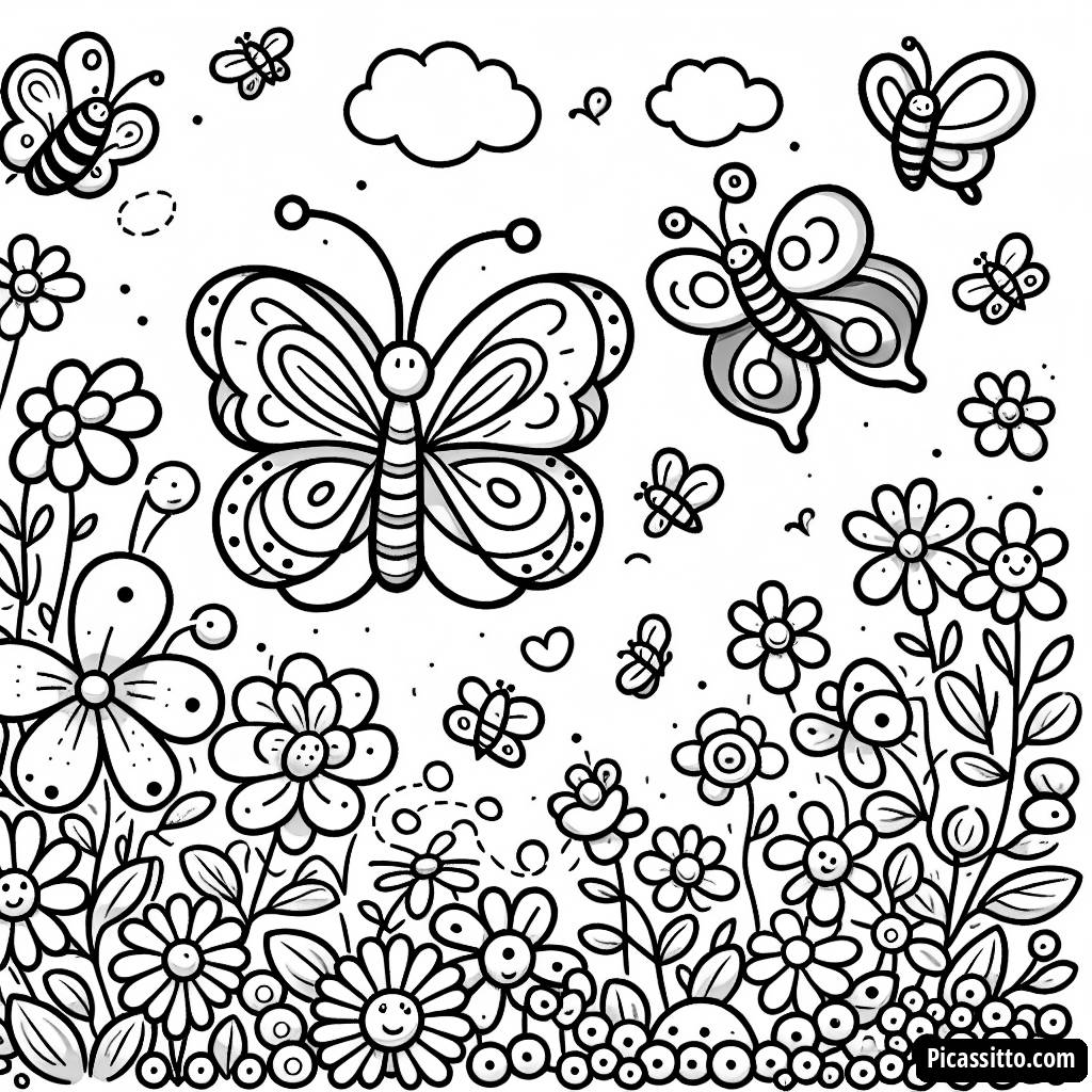 Aproveite uma encantadora página para colorir do Jardim de Borboletas, repleto de flores bonitas e abelhas zumbidoras! Esta página imprimível é gratuita para as crianças liberarem sua criatividade.