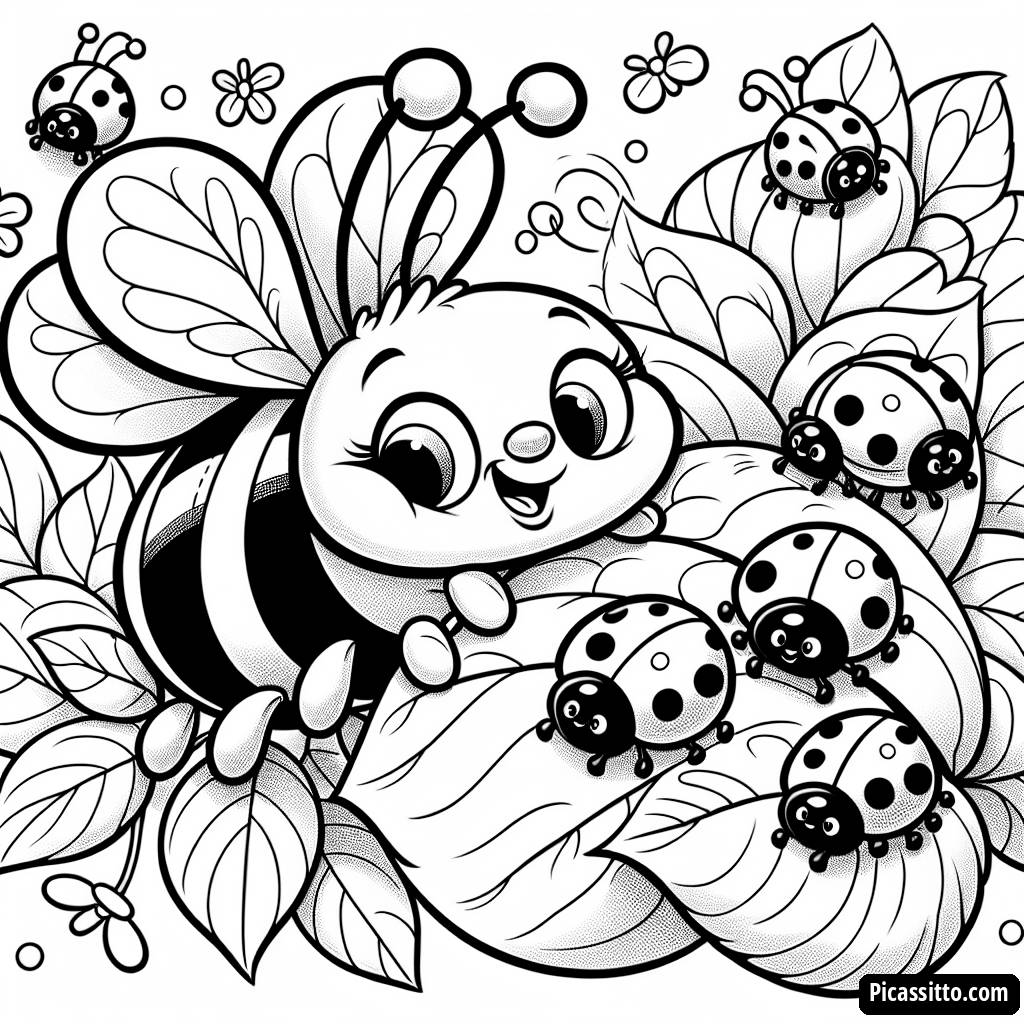 Baixe esta página para colorir gratuita e imprimível com uma abelha feliz zumbindo ao redor de joaninhas coloridas em uma folha. Perfeita para pequenos artistas que amam insetos!